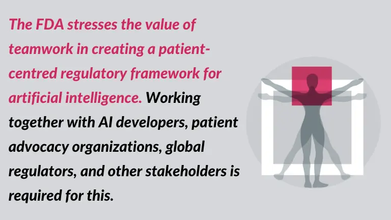 The FDA stresses the value of teamwork in creating a patient-centred regulatory framework for artificial intelligence. Working together with AI developers, patient advocacy organizations, global regulators, and other stakeholders is required for this. The organization intends to collaborate with other organizations to address niche issues like quality control and cybersecurity. To guarantee the responsible use of AI in medical products, the FDA also plans to launch training initiatives aimed at regulatory authorities, medical experts, patients, and business stakeholders.