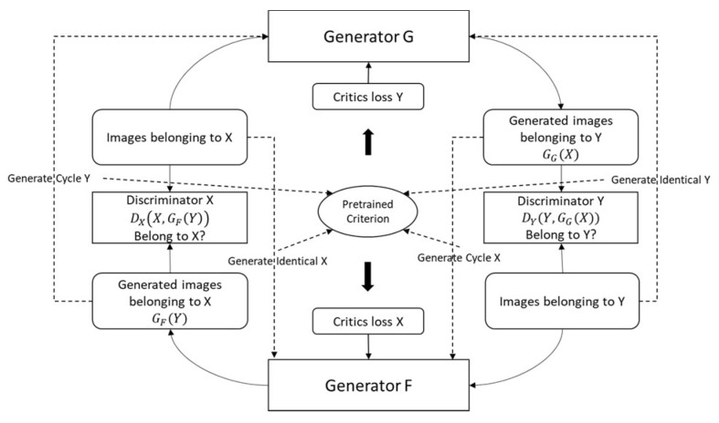 Figure 1. Ad CycleGAN Architecture. Source: Liang Z, Huang JX, Antani S. Image Translation by Ad CycleGAN for COVID-19 X-Ray Images: A New Approach for Controllable GAN. Sensors (Basel). 2022 Dec 8;22(24):9628. doi: 10.3390/s22249628. PMID: 36559994; PMCID: PMC9785652.