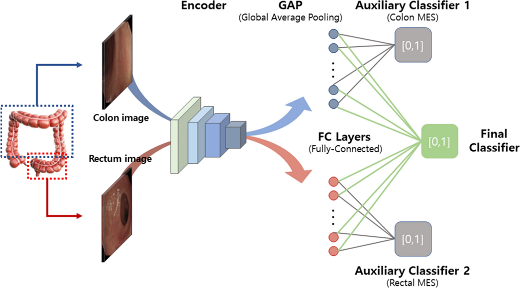 Kim et al. (2023) contributed to this field by developing a deep learning model to classify endoscopic images according to the severity of ulcerative colitis, using the Mayo score as a benchmark. Their model includes a CNN-based encoder and dual auxiliary classifiers for the colon and rectum, which effectively recognize visual patterns associated with various levels of disease severity. Specifically, the model addresses a critical issue in distinguishing between Mayo scores 0/1 and 1/2, which is particularly challenging due to the subtle differences in visual indicators associated with these scores.
