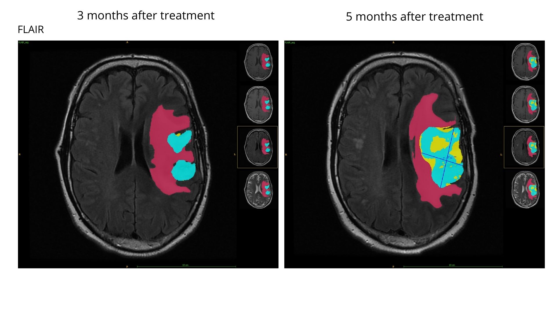 The patient responded well to the treatment, and we observed a strong enhancing tumor (ET) regression for this patient a year after the treatment. Automatic RANO measurement (marked with blue line segments in both scans) and ET volume both significantly decreased (-78% and -93% respectively). In summary, the region of edema became much smaller, and necrosis was nearly absent.