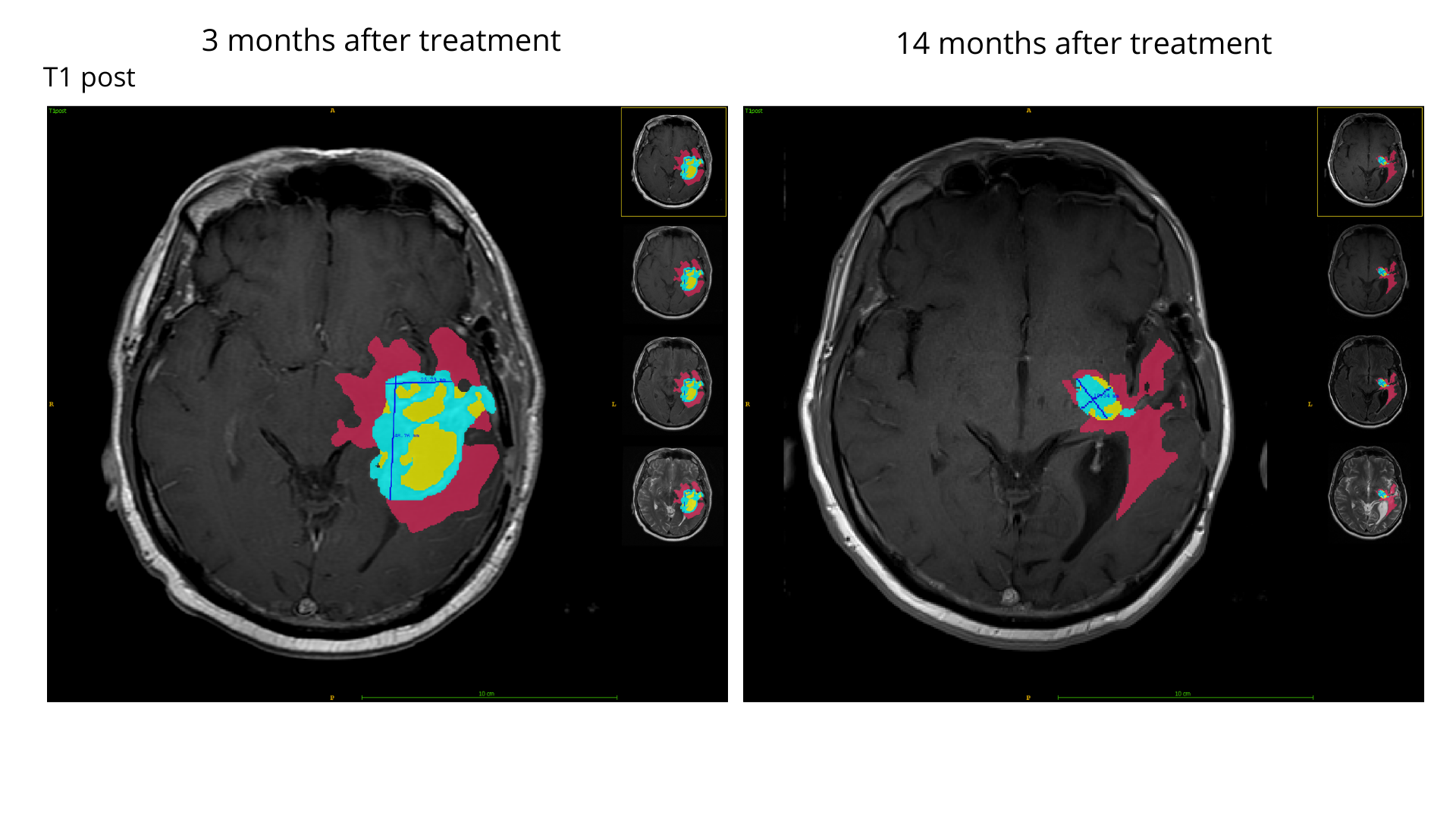 Moreover, we are able to develop custom automated and semi-automated algorithms that analyze the brain and brain lesions, according to your need. As a result, the following example illustrates how our algorithms have been used to assess brain tumor segmentation, treatment and progression.
